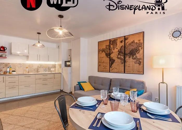 Appartement Cosy Tres Proche Disney lägenhet erbjuder ett komplett kök samt rum med te/kaffebryggare, teve och plattskärms-TV med satellitkanaler. Gäster kan besöka Aquarium Sea Life Paris Val D'Europe, som placeras 4 km bort eller Disneyland Resort Paris, som ligger 2 km från boendet.